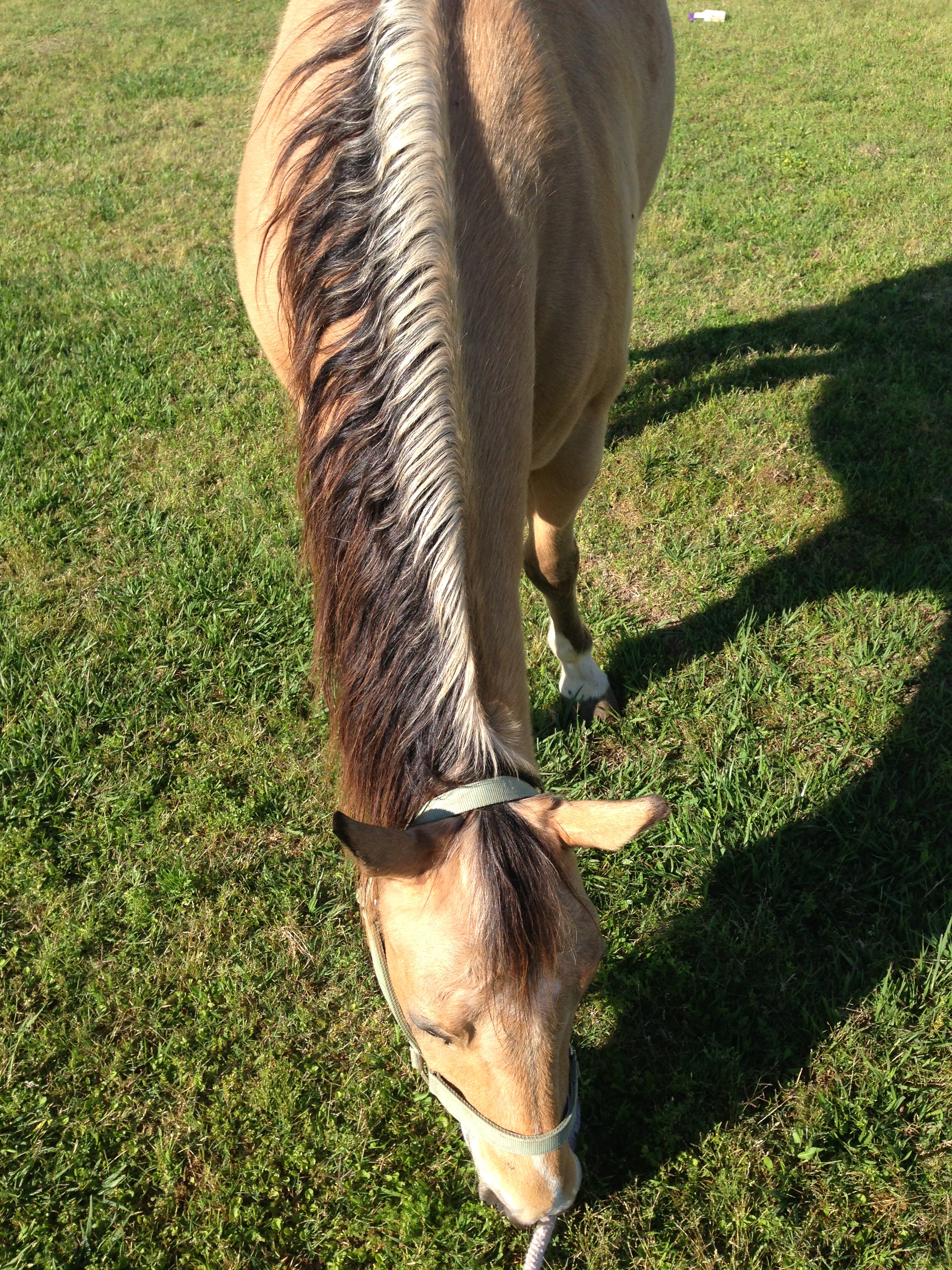 I was fond of saying, when particularly drained from the utter pointlessness and repetitiveness of the busywork I did all day at my last job, that I would rather be mucking stalls. At least then I’d be using my body instead of deteriorating in front of a computer. I don’t have to muck stalls at this job, but I certainly do use my body. I’m in constant movement: getting the horses from their stalls, grooming them and picking their hooves and tacking them up and untacking them and putting the equipment away and turning them out, cleaning up the barn and the tack room and the arena. And that’s not even taking into account the work in the ring with my students: lugging the mounting block around, helping them mount, walking (or running) alongside them to help them control their horses or understand new concepts, moving around poles and jump standards…I downloaded a step counter for my phone, and in the approximately 3 1/2 hours I work in an evening, I easily get in 8,000–10,000 steps. And that’s after doing all those things with Dunnie and then riding him. The first week I worked, I was utterly wrecked.